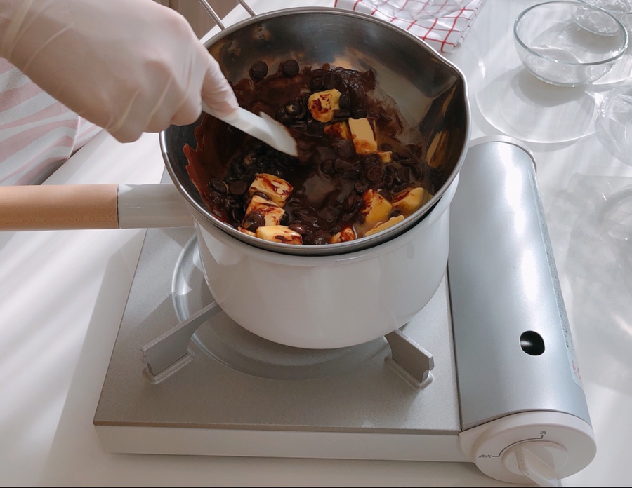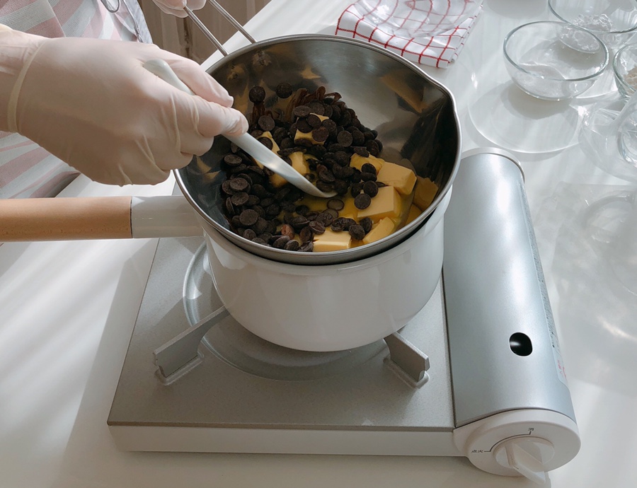 중탕볼에 든 버터와 다크 초콜릿을 약불로 끓이며 완전히 녹여주세요.