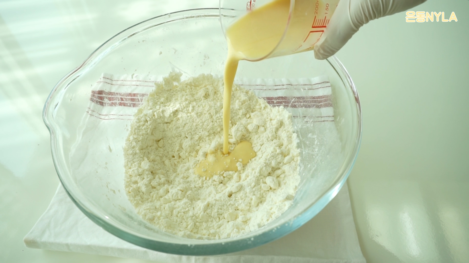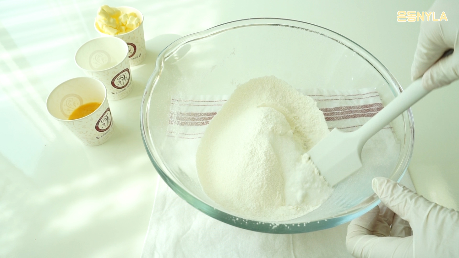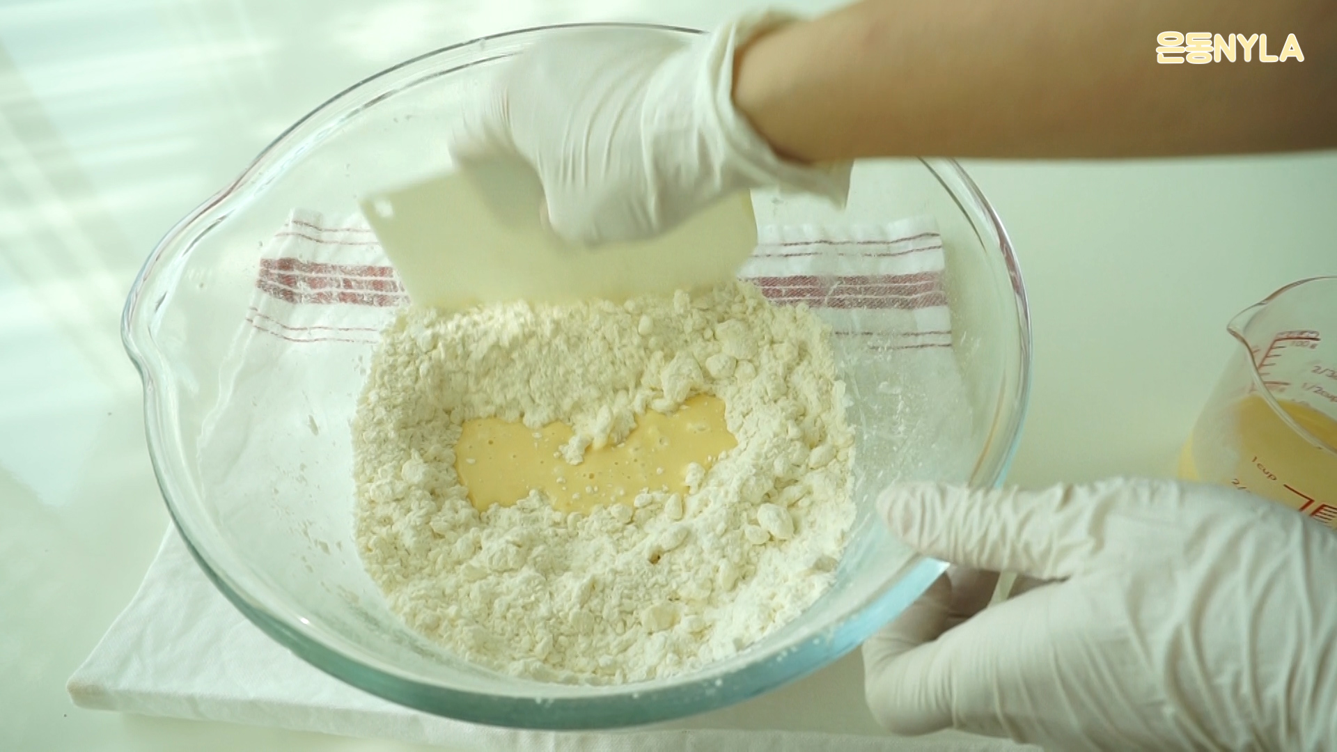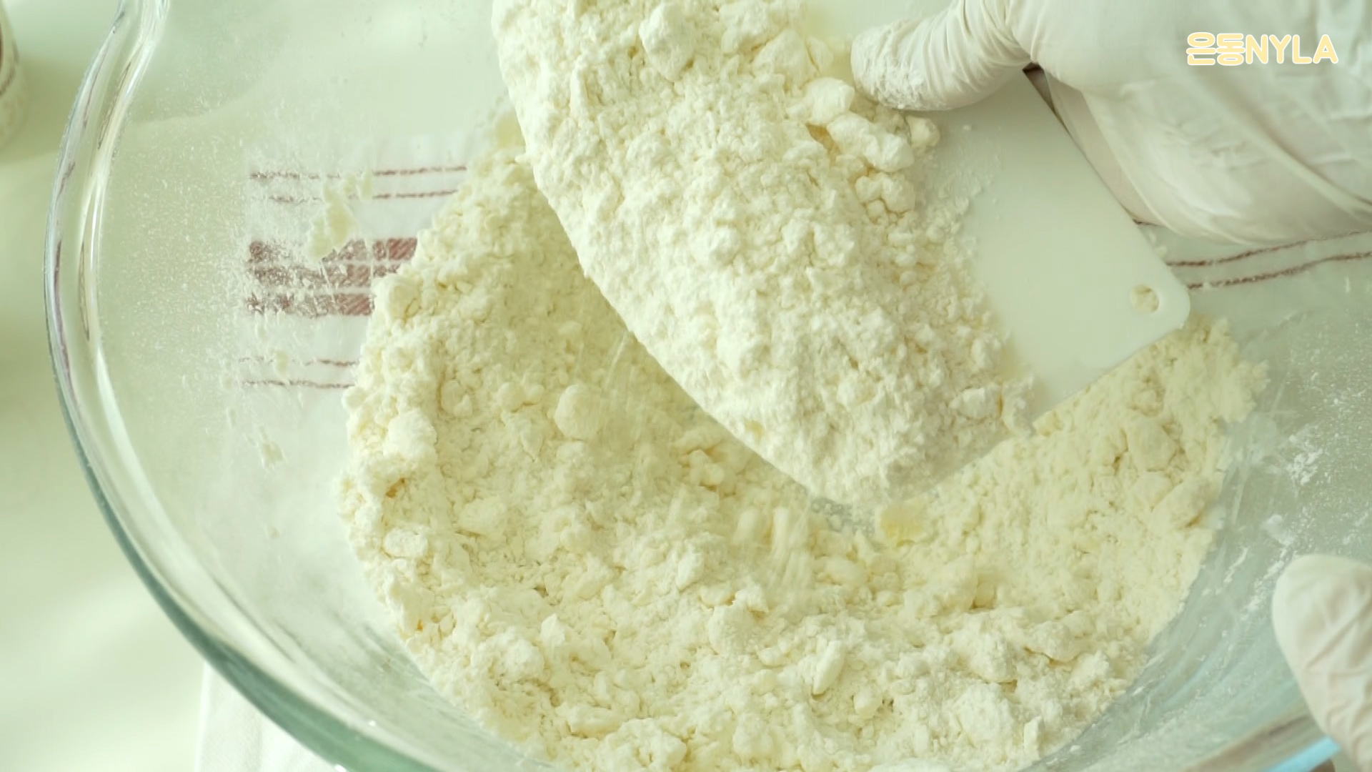 스크래퍼로 버터를 잘게 자르며 섞어주세요